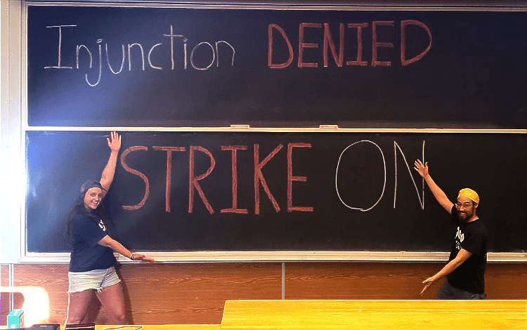 Members of the Graduate Employees’ Organization celebrate a judge’s ruling this week denying U-M’s bid to halt the strike by judicial fiat. At a meeting on Wednesday night, most members recommitted to continue the work action. Courtesy: GEO’s Twitter feed.