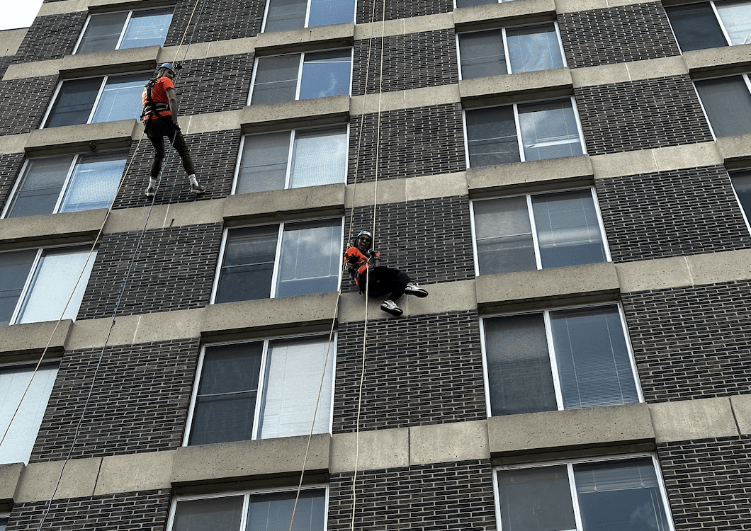 Jenna Dawson, right, hangs alongside another rappeller making their way down EMU’s Hill Hall last year for the Over the Edge fundraiser for Friends In Deed. This year’s event is Aug. 17; each participant must raise at least $1,000 for the Ypsi-based anti-poverty nonprofit via this site. Credit: Steve Friess.