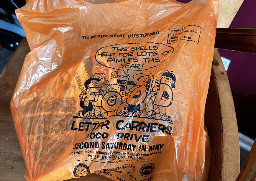 Residents are urged to fill these orange bags with nonperishable food items and leave them by the mailbox to be taken by letter carriers on Saturday for the annual Stamp Out Hunger food drive The donations locally go to Food Gatherers. Credit: Steve Friess.