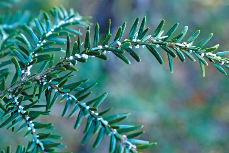 The hemlock woolly adegid’s tell-tale egg masses are seen on a tree in the Arb. To slow the spread of these destructive, invasive insects, U-M will spend an estimated $50,000 treating the Arb’s hemlocks individually with an insecticide, as Brooke Black reports in the December issue of the Observer. Credit: Mark Bialek.