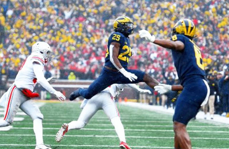 Michigan running back Hassan Haskins leaps an Ohio State defender late in Michigan’s 42-27 win on Saturday. Photo: Bryan Fuller Photography.