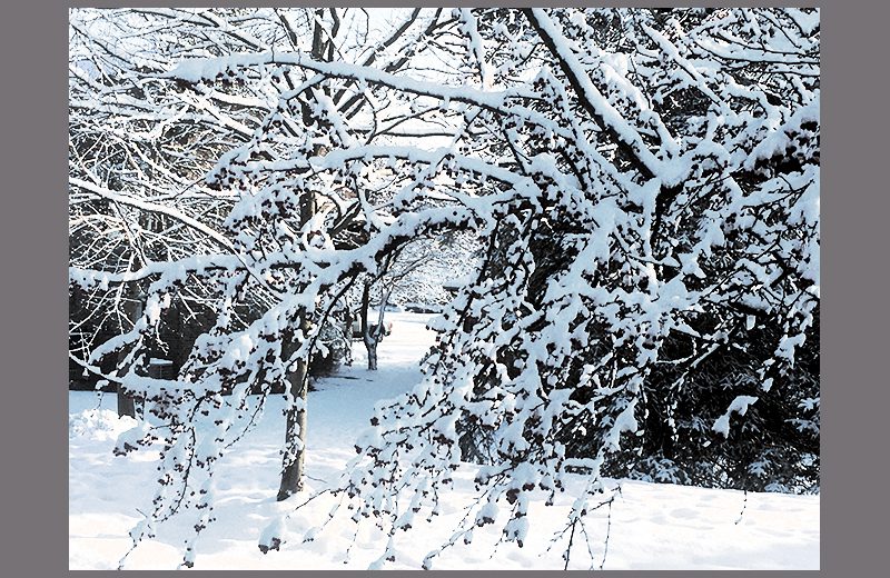 Snowfall during the Ohio State-Michigan game covers berries on a Northeast Ann Arbor tree. Photo: Micheline Maynard