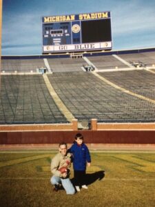 A few days later, a nurse at our pediatrician’s office suggested that we might go into Michigan Stadium, which was always unlocked, and just a block away from the office. We walked over, not knowing what to expect, and found the huge, quiet field wide open. I had never been there, and with Sam, experienced a thrill as we climbed to one of the openings, and looked out over the 101,007 empty seats. We, of course, had our football with us, and played catch on the field, alone with the birds and the echo of our voices. We both felt like lucky kids.